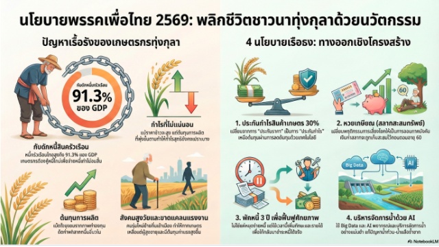 ขณะเดียวกัน พรรคเพื่อไทยยังเสนอ พักหนี้เกษตรกร 3 ปี ทั้งต้นและดอก สำหรับหนี้ไม่เกิน 500,000 บาท โดยเน้นใช้ช่วงเวลานี้ฟื้นฟูศักยภาพการผลิต ไม่ใช่แค่ “หยุดเวลา” เพื่อให้เมื่อครบกำหนด เกษตรกรมีรายได้เพียงพอชำระหนี้ได้จริง