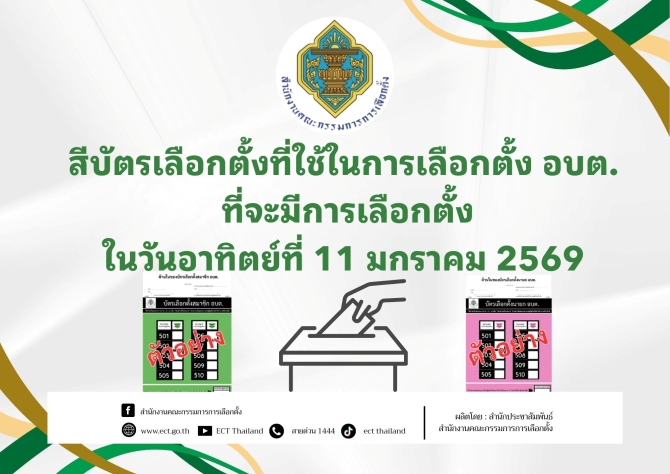 สำนักงานคณะกรรมการการเลือกตั้ง ขอประชาสัมพันธ์สีบัตรเลือกตั้งที่ใช้ในการเลือกตั้งสมาชิกสภาองค์การบริหารส่วนตำบลและนายกองค์การบริหารส่วนตำบล ที่จะมีการเลือกตั้งในวันอาทิตย์ที่ 11 มกราคม 2569 ตั้งแต่เวลา 08.00 – 17.00 นาฬิกา โดยแยกสีบัตรเลือกตั้งให้มีความแตกต่างกันระหว่างบัตรเลือกตั้งสมาชิกสภาองค์การบริหารส่วนตำบลและบัตรเลือกตั้งนายกองค์การบริหารส่วนตำบล ดังนี้