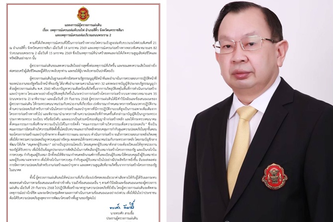 เมื่อวันที่ 16 มกราคม 2569 นายทรงศัก สายเชื้อ ประธานผู้ตรวจการแผ่นดิน ออกแถลงการณ์กรณีเกิดเหตุเครนที่ใช้ในการก่อสร้างโครงการรถไฟความเร็วสูงถล่มทับขบวนรถไฟด่วนพิเศษที่ 21 ณ อำเภอสีคิ้ว จังหวัดนครราชสีมา เมื่อวันที่ 14 มกราคม 2569 และเหตุเครนก่อสร้างทางหลวงพิเศษหมายเลข 82 ร่วงลงบนถนนพระราม 2 เมื่อวันที่ 15 มกราคม 2569 ซึ่งเป็นเหตุการณ์ที่เศร้าสลดและสร้างความสูญเสียต่อชีวิต รวมถึงทรัพย์สินอย่างมาก ก่อให้เกิดความสะเทือนใจแก่สังคมอย่างยิ่ง โดยผู้ตรวจการแผ่นดินขอแสดงความเสียใจอย่างสุดซึ้งต่อครอบครัวผู้เสียชีวิตและผู้ได้รับบาดเจ็บ พร้อมทั้งขอส่งกำลังใจให้ผู้ได้รับบาดเจ็บทุกท่านฟื้นตัวและกลับมาเป็นปกติโดยเร็ว ทั้งนี้ เห็นว่าเหตุการณ์ดังกล่าวไม่ใช่เหตุเฉพาะหน้า แต่สะท้อนถึงช่องว่างด้านการกำกับดูแลความปลอดภัยในโครงการก่อสร้างของรัฐ ซึ่งจำเป็นต้องได้รับการทบทวน และปรับปรุงอย่างจริงจังและเร่งด่วน