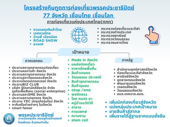 โดยในแต่ละจังหวัดมีภาคีครบทุกมิติ ทั้งสภาอุตสาหกรรมท่องเที่ยว หอการค้า สภาวัฒนธรรม โอท็อปเทรดเดอร์ ภาคธุรกิจเพื่อสังคม สภาเอสเอ็มอี และเครือข่ายเยาวชนธุรกิจ ซึ่งเป็นคนเก่งในพื้นที่ที่รู้จักจังหวัดของตนดีที่สุด รัฐต้องใช้ศักยภาพของคนเหล่านี้ไปบุกตลาดโลก พร้อมสนับสนุนโครงสร้างพื้นฐาน ถนน ห้องน้ำ ประปา ไฟฟ้า และการพัฒนาชุมชน เพื่อให้รองรับนักท่องเที่ยวได้อย่างแท้จริง