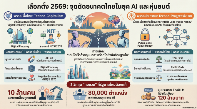 นักวิเคราะห์สรุปว่า การเลือกตั้งปี 2569 ไม่ใช่เพียงการเลือกผู้แทนราษฎร แต่คือการเลือกเส้นทางของประเทศในยุค AI ครองเมือง ระหว่างการเติบโตอย่างรวดเร็วด้วยทุนและเทคโนโลยีจากภายนอก หรือการสร้างความเข้มแข็งจากภายในด้วยการกระจายโอกาสและอธิปไตยดิจิทัล