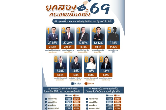 เมื่อวันที่ 30 มกราคม ศูนย์สำรวจความคิดเห็น “นิด้าโพล” สถาบันบัณฑิตพัฒนบริหารศาสตร์ (นิด้า) เปิดเผยผลการสำรวจ เรื่อง “ยกสอง กระแสเลือกตั้ง 69” ทำการสำรวจระหว่างวันที่ 23-27 มกราคม 2569 จากประชาชนที่มีอายุ 18 ปีขึ้นไป กระจายทุกภูมิภาค ระดับการศึกษา อาชีพ และรายได้ ทั่วประเทศ รวมจำนวนทั้งสิ้น 2,500 หน่วยตัวอย่าง เกี่ยวกับกระแสการเลือกตั้ง ปี 2569 การสำรวจอาศัยการสุ่มตัวอย่างโดยใช้ความน่าจะเป็นจากบัญชีรายชื่อฐานข้อมูลตัวอย่างหลัก (Master Sample) ของ “นิด้าโพล” สุ่มตัวอย่างแบบหลายขั้นตอน (Multi-stage Sampling) เก็บข้อมูลด้วยวิธีการสัมภาษณ์ทางโทรศัพท์ โดยกำหนดค่าความคลาดเคลื่อนไม่เกิน 0.05 ที่ระดับความเชื่อมั่น ร้อยละ 97.0