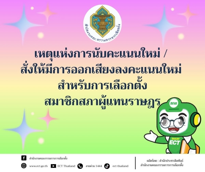 สำนักงานคณะกรรมการการเลือกตั้ง ขอประชาสัมพันธ์เหตุแห่งการนับคะแนนใหม่ / สั่งให้มีการออกเสียงลงคะแนนใหม่ สำหรับการเลือกตั้งสมาชิกสภาผู้แทนราษฎร ตามพระราชบัญญัติประกอบรัฐธรรมนูญว่าด้วยการเลือกตั้งสมาชิกสภาผู้แทนราษฎร พ.ศ. 2561 และที่แก้ไขเพิ่มเติม ดังนี้