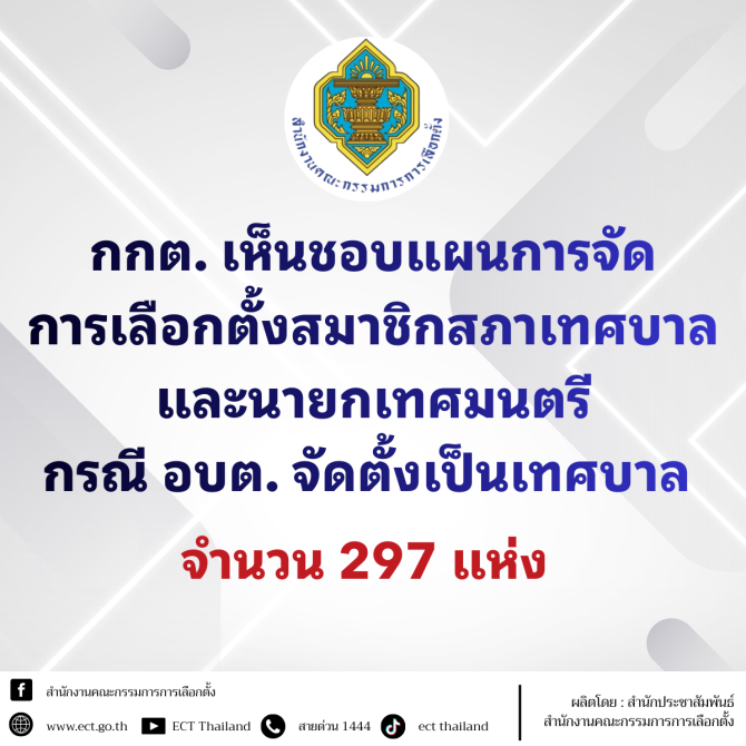 - กกต. เห็นชอบแผนการจัดการเลือกตั้งสมาชิกสภาเทศบาลและนายกเทศมนตรี กรณี อบต. จัดตั้งเป็นเทศบาล 297 แห่ง 18 ก.พ. 2569