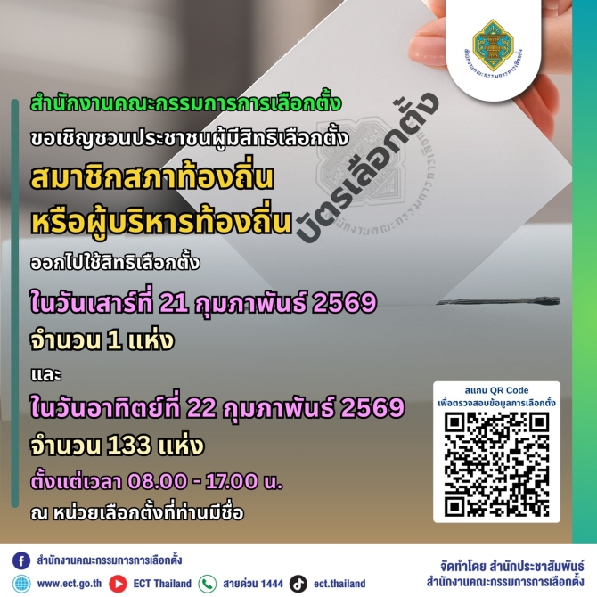- กกต.เชิญชวนเลือกตั้งสมาชิกสภาท้องถิ่นหรือผู้บริหารท้องถิ่น 21-22 กุมภาพันธ์ 2569 20 ก.พ. 2569