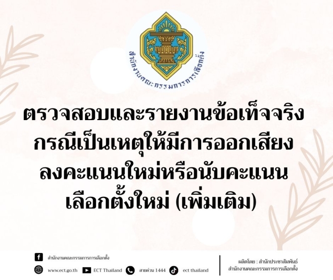 กกต.สั่งทุกจังหวัดตรวจสอบและรายงานข้อเท็จจริงกรณีเป็นเหตุให้มีการออกเสียงลงคะแนนใหม่หรือนับคะแนนเลือกตั้งใหม่ (เพิ่มเติม)