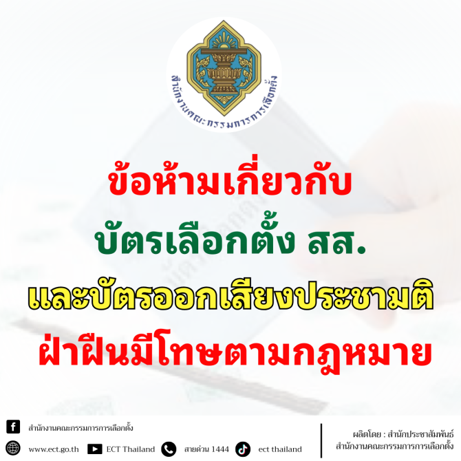 สำนักงานคณะกรรมการการเลือกตั้ง ขอประชาสัมพันธ์ข้อห้ามเกี่ยวกับบัตรเลือกตั้ง สส. และบัตรออกเสียงประชามติ เพื่อคุ้มครองสิทธิและเสรีภาพของผู้มีสิทธิเลือกตั้ง รักษาความลับ ในการลงคะแนน และให้การออกเสียงลงคะแนนเป็นไปโดยสุจริต เที่ยงธรรม และชอบด้วยกฎหมาย ดังนี้