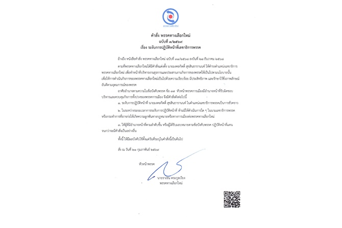 ทั้งนี้ คำสั่งดังกล่าวมีผลตั้งแต่วันที่ระบุในคำสั่ง (21 กุมภาพันธ์ 2569) เป็นต้นไป ลงนามโดย นายราเชน ตระกูลเวียง หัวหน้าพรรคทางเลือกใหม่