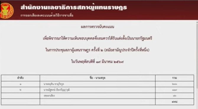 - 293 เสียง! สภาฯโหวตหนุน "อนุทิน ชาญวีรกูล" เป็นนายกรัฐมนตรีคนที่ 33 19 มี.ค. 2569