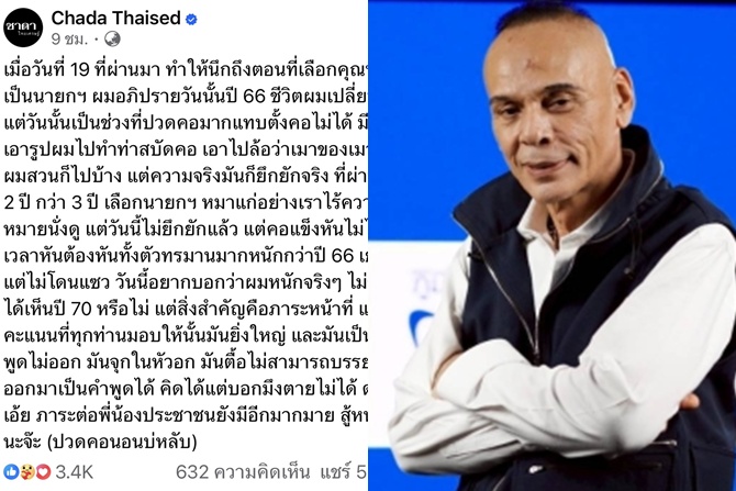 เมื่อวันที่ 22 มี.ค.2569 นายชาดา ไทยเศรษฐ์ สส.อุทัยธานี พรรคภูมิใจไทย โพสต์ข้อความผ่านทางเฟซบุ๊ก Chada Thaised ระบุ ว่า เมื่อวันที่ 19 มี.ค.ที่ผ่านมา ทำให้นึกถึงตอนที่เลือกคุณพิธา ลิ้มเจริญรัตน์ เป็นนายกฯ ผมอภิปรายวันนั้นปี 66 ชีวิตผมเปลี่ยนไป แต่วันนั้นเป็นช่วงที่ปวดคอมากแทบตั้งคอไม่ได้ มีสื่อเอารูปผมไปทำท่าสะบัดคอ เอาไปล้อว่าเมาของ เมายา ผมก็สวนไปบ้าง แต่ความจริงมันก็ยึกยักจริง ที่ผ่านมา 2 ปี กว่า 3 ปี เลือกนายกฯ หมาแก่อย่างเราไร้ความหมายนั่งดู แต่วันนี้ไม่ยึกยักแล้ว แต่คอแข็งหันไม่ได้เลย เวลาหันต้องหันทั้งตัวทรมานมากหนักกว่าปี 66 เยอะ แต่ไม่โดนแซว วันนี้อยากบอกว่าผมหนักจริงๆ ไม่รู้ว่าจะได้เห็นปี 70 หรือไม่