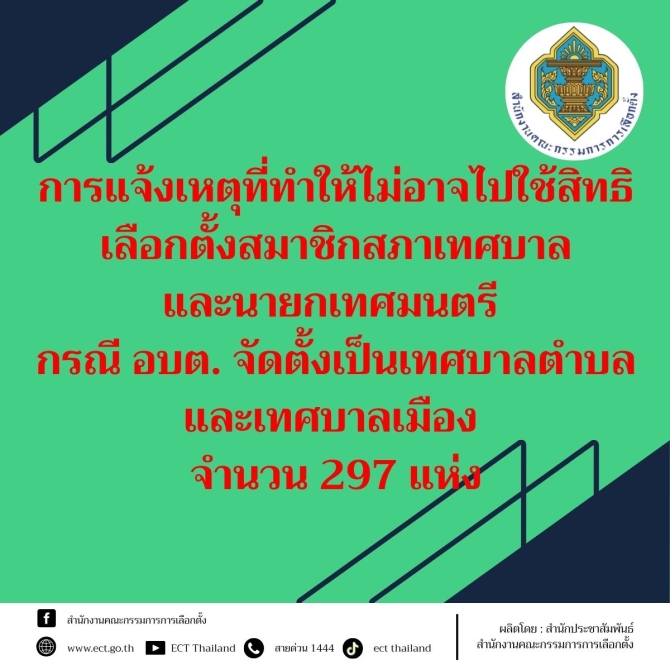 การแจ้งเหตุที่ทำให้ไม่อาจไปใช้สิทธิเลือกตั้งสมาชิกสภาเทศบาลและนายกเทศมนตรี กรณี อบต. จัดตั้งเป็นเทศบาลตำบลและเทศบาลเมือง จำนวน 297 แห่ง