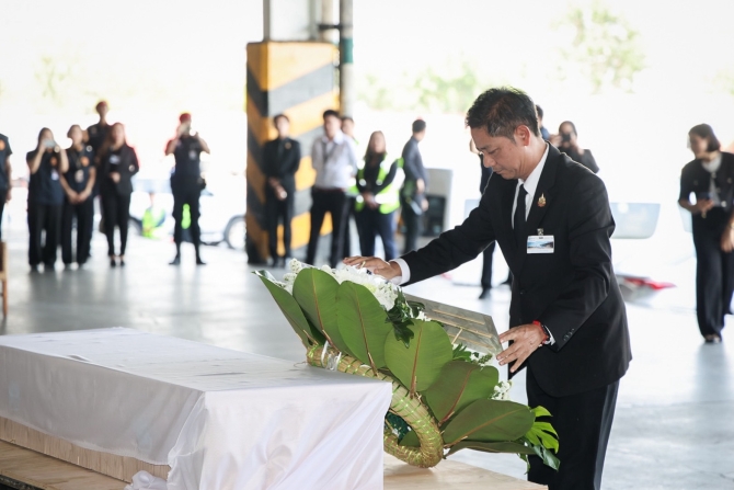 เมื่อวันที่ 27 มีนาคม 2569 เวลา 13.30 น. นายพิเชษฐ์ ทองพันธ์ รองปลัดกระทรวงแรงงาน พร้อมด้วย นายบัญชา ยืนยงจงเจริญ รองอธิบดีกรมการกงสุล นายศักดินาถ สนธิศักดิ์โยธิน ผู้ช่วยปลัดกระทรวงแรงงาน และ Mrs. Dvora Dorsman Yarkoni รองหัวหน้าสำนักงานสถานเอกอัครราชทูตอิสราเอลประจำประเทศไทย ร่วมพิธีรับร่างและไว้อาลัย นายชัยวัฒน์ แววนิล แรงงานไทยที่เสียชีวิตจากเหตุการณ์สู้รบในภูมิภาคตะวันออกกลาง เมื่อวันที่ 18 มีนาคมที่ผ่านมา ณ ท่าอากาศยานสุวรรณภูมิ ก่อนจะส่งกลับไปประกอบพิธีทางศาสนาที่จังหวัดชัยภูมิต่อไป