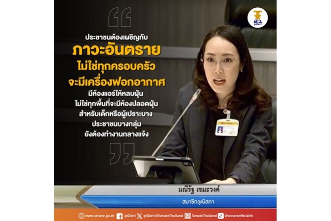 ด้าน น.ส.มณีรัฐ เขมะวงค์ สมาชิกวุฒิสภา ได้อภิปรายสะท้อนประสบการณ์ตรงของประชาชนในพื้นที่ภาคเหนือว่า “ประชาชนต้องเผชิญกับภาวะอันตราย ไม่ใช่ทุกครอบครัวจะมีเครื่องฟอกอากาศ หรือห้องปลอดฝุ่น เด็กและผู้เปราะบางจำนวนมากยังต้องอยู่กับฝุ่นพิษ และบางกลุ่มยังต้องทำงานกลางแจ้ง”