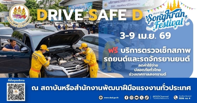 ทั้งนี้ กรมพัฒนาฝีมือแรงงาน ได้จัดให้มีบริการตรวจเช็กสภาพรถยนต์และรถจักรยานยนต์ฟรีในช่วงก่อนเทศกาล ระหว่างวันที่ 3 – 9 เมษายน 2569 ณ สถาบันพัฒนาฝีมือแรงงานและสำนักงานพัฒนาฝีมือแรงงานทั่วประเทศ โดยให้บริการตรวจสภาพเครื่องยนต์ ระบบไฟฟ้า ระบบเบรก ระดับน้ำมันเครื่อง และอุปกรณ์ที่เกี่ยวข้อง โดยช่างซ่อมที่ให้บริการตรวจเช็คการันตีที่มีความเชี่ยวชาญ เพื่อให้ยานพาหนะมีความพร้อมใช้งาน ลดความเสี่ยงในการเกิดอุบัติเหตุ รวมถึงช่วยประหยัดพลังงานและค่าใช้จ่ายในระยะยาว