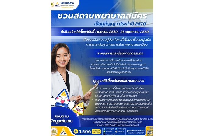 เมื่อวันที่ 4 เมษายน 2569 นางสาวกาญจนา พูลแก้ว เลขาธิการสำนักงานประกันสังคม กล่าวถึง การเปิดรับสมัครสถานพยาบาลเข้าร่วมเป็นสถานพยาบาลคู่สัญญาเพื่อให้บริการทางการแพทย์แก่ผู้ประกันตน ประจำปี 2570 เพื่อรองรับจำนวนผู้ประกันตนที่เพิ่มมากขึ้นในแต่ละปี และเป็นการกระตุ้นให้สถานพยาบาลเกิดการแข่งขันด้านการให้บริการและคุณภาพในการรักษาพยาบาลแก่ผู้ประกันตน โดยสถานพยาบาลที่มีความประสงค์เข้าร่วมเป็นสถานพยาบาลคู่สัญญากับสำนักงานประกันสังคม สามารถยื่นความประสงค์ผ่านระบบอิเล็กทรอนิกส์ผ่านเว็บไซต์ https://mms.sso.go.th ตั้งแต่บัดนี้ถึง 31 พฤษภาคม 2569