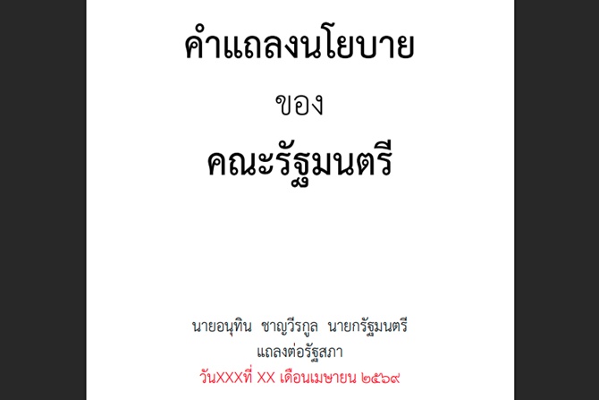 - เปิดคำแถลงนโยบายรัฐบาล “อนุทิน 2” ชู 5 นโยบายหลัก รวม 21 หน้า ต่อรัฐสภา วันที่ 9-10 เม.ย.นี้ 6 เม.ย. 2569