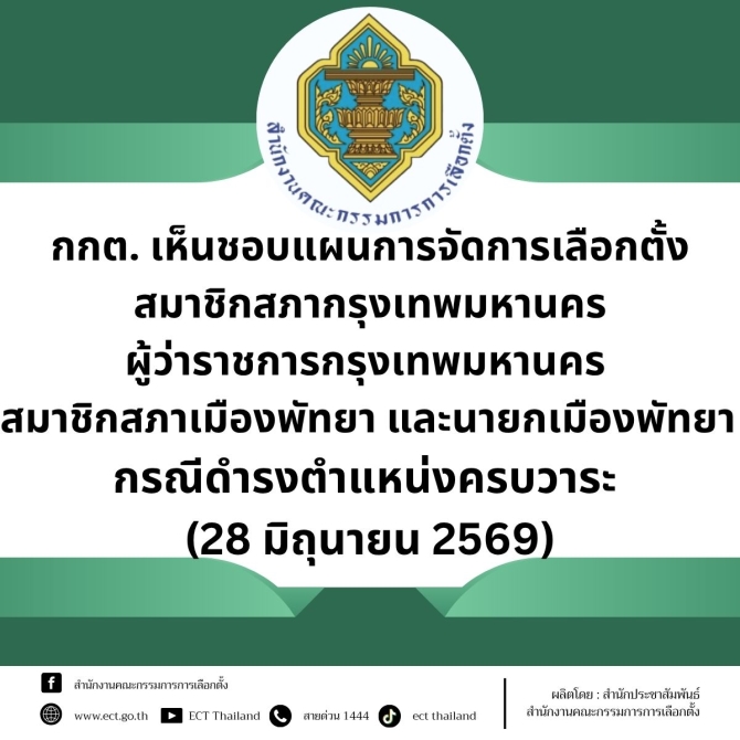 สำนักงานคณะกรรมการการเลือกตั้ง ขอประชาสัมพันธ์ว่า คณะกรรมการการเลือกตั้งได้มีมติเห็นชอบแผนการจัดการเลือกตั้งสมาชิกสภากรุงเทพมหานคร ผู้ว่าราชการกรุงเทพมหานคร สมาชิกสภาเมืองพัทยา และนายกเมืองพัทยา กรณีดำรงตำแหน่งครบวาระ (28 มิถุนายน 2569) (รายละเอียดตามเอกสารแนบ)