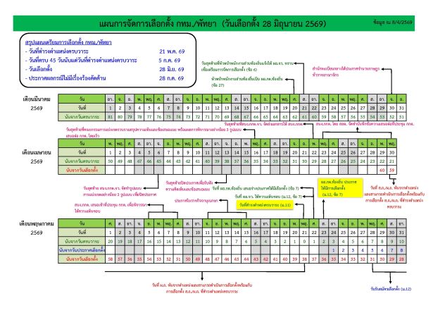 ทั้งนี้ การกำหนดวันรับสมัครรับเลือกตั้งสมาชิกสภากรุงเทพมหานคร ผู้ว่าราชการกรุงเทพมหานคร สมาชิกสภาเมืองพัทยา และนายกเมืองพัทยา ระหว่างวันที่ 28 พฤษภาคม –1 มิถุนายน 2569 และวันเลือกตั้ง ในวันอาทิตย์ที่ 28 มิถุนายน 2569 เวลา 08.00 – 17.00 น.