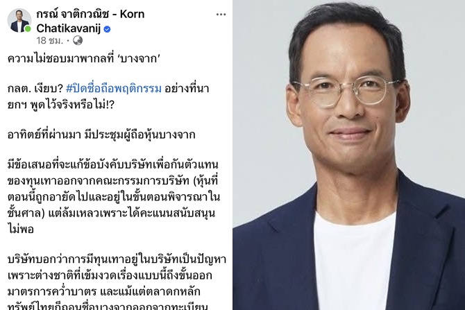เมื่อวันที่ 12 เมษายน 2569 นายกรณ์ จาติกวณิช รองหัวหน้าพรรคประชาธิปัตย์ โพสต์เฟซบุ๊กส่วนตัวจั่วหัวว่า “ความไม่ชอบมาพากลที่บางจาก“ โดยระบุว่า กลต. เงียบ ? #ปิดชื่อถือพฤติกรรม อย่างที่นายกฯ พูดไว้จริงหรือไม่!?