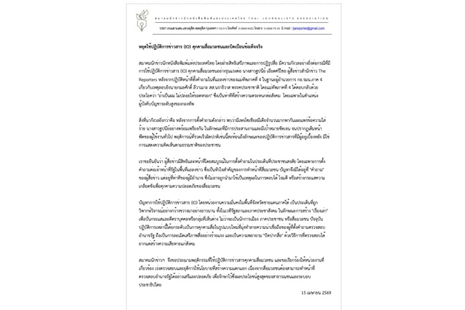 สมาคมนักข่าวฯ จึงขอประณามพฤติกรรมที่ใช้ปฏิบัติการข่าวสารคุกคามสื่อมวลชน และขอเรียกร้องให้หน่วยงานที่เกี่ยวข้อง เร่งตรวจสอบและยุติการใช้นโยบายที่สร้างความแตกแยก เนื่องจากสื่อมวลชนต้องสามารถทำหน้าที่ตรวจสอบอำนาจรัฐได้อย่างเสรีและปลอดภัย เพื่อรักษาไว้ซึ่งผลประโยชน์สูงสุดของสาธารณชนและระบอบประชาธิปไตย