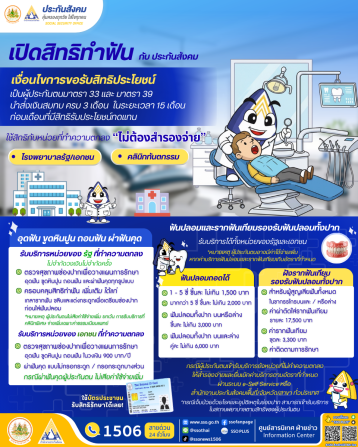 ด้าน นางสาวกาญจนา พูลแก้ว เลขาธิการสำนักงานประกันสังคม กล่าวเพิ่มเติมว่า สิทธิประโยชน์กรณีทันตกรรมจะเกิดขึ้น เมื่อผู้ประกันตนส่งเงินสมทบครบ 3 เดือน ภายในระยะเวลา 15 เดือน ก่อนวันที่เข้ารับบริการ และรวมถึงหลังจากที่สิ้นสุดความเป็นผู้ประกันตนไม่เกิน 6 เดือน กรณีใช้บริการกับสถานพยาบาลที่ไม่ได้ทำความตกลงกับสำนักงานประกันสังคม ไม่ว่าจะเป็นสถานพยาบาลของรัฐหรือเอกชนจะต้องสำรองจ่ายไปก่อนแล้วสามารถยื่นขอรับเงินคืนได้ตามหลักเกณฑ์ ผ่านระบบ e-Self Service หรือยื่นที่สำนักงานประกันสังคมทั่วประเทศ โดยสามารถสอบถามข้อมูลเพิ่มเติมได้ที่สำนักงานประกันสังคมกรุงเทพมหานครพื้นที่/จังหวัด/สาขา ทั่วประเทศ หรือสายด่วนประกันสังคม 1506 ตลอด 24 ชั่วโมง