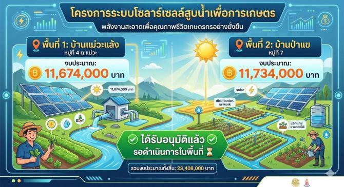 เมื่อวันที่ 24 เมษายน 2569 นส.เพ็ญภัค รัตนคำฟู สส.เขต4 จังหวัดลำปาง พรรคกล้าธรรม (กธ.) เปิดเผยว่า ข่าวดี กรมทรัพยากรน้ำ ได้มีการอนุมัติ “โครงการโซลาร์เซลล์สูบน้ำเพื่อการเกษตร" เป็นการพลิกฟื้นผืนดิน และสร้างความมั่นคงทางน้ำให้แก่เกษตรกร เตรียมลงพื้นที่ดำเนินการเร็วๆ นี้ เพื่อเปลี่ยนแสงแดดให้เป็นสายน้ำหล่อเลี้ยงพื้นที่การเกษตรของเรา
