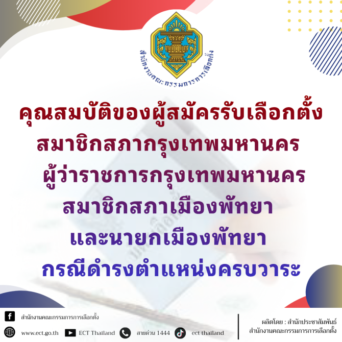 สำนักงานคณะกรรมการการเลือกตั้ง จึงขอประชาสัมพันธ์คุณสมบัติของผู้สมัคร รับเลือกตั้งสมาชิกสภากรุงเทพมหานคร ผู้ว่าราชการกรุงเทพมหานคร สมาชิกสภาเมืองพัทยา และนายกเมืองพัทยา เพื่อให้การดำเนินการเกี่ยวกับการพิจารณาคุณสมบัติเป็นไปด้วยความเรียบร้อยและถูกต้องตามพระราชบัญญัติการเลือกตั้งสมาชิกสภาท้องถิ่นหรือผู้บริหารท้องถิ่น พ.ศ. 2562 และที่แก้ไขเพิ่มเติม ดังนี้