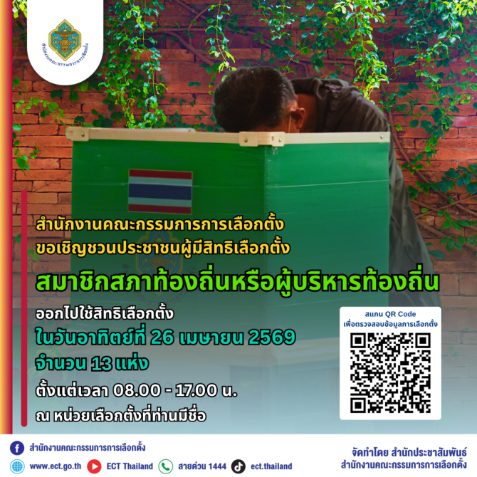 กกต.เชิญชวนเลือกตั้งสมาชิกสภาท้องถิ่นหรือผู้บริหารท้องถิ่น 13 แห่ง 26 เมษายน 2569