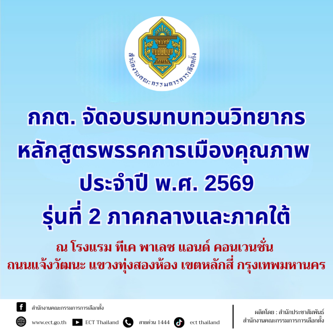 กกต. จัดอบรมทบทวนวิทยากรหลักสูตรพรรคการเมืองคุณภาพ ประจำปี พ.ศ. 2569 รุ่นที่ 2 ภาคกลางและภาคใต้