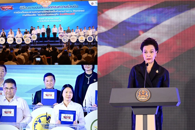 นางศุภจี สุธรรมพันธุ์ กล่าวว่า ปัญหาทุนเทาและนอมินีเป็นอุปสรรคสำคัญที่ขัดขวางการเติบโตของเศรษฐกิจไทย ความร่วมมือในครั้งนี้จึงไม่ใช่เพียงการลงนามในเอกสาร แต่เป็นการยกระดับการทำงานที่เริ่มมาตั้งแต่ปลายปีที่ผ่านมาให้มีความเป็นรูปธรรมยิ่งขึ้น โดยมุ่งเน้นไปที่กลุ่มนิติบุคคลจดทะเบียนกว่า 9.8 แสนราย เพื่อคัดกรองและเฝ้าระวังกลุ่มเสี่ยงผ่าน 3 ยุทธศาสตร์หลัก ได้แก่ การเชื่อมโยงข้อมูลแบบไร้รอยต่อระหว่างหน่วยงาน การสร้างกลไกเตือนภัย และการเสริมสร้างความเชื่อมั่นว่าการประกอบธุรกิจในไทยต้องมีความโปร่งใสและเป็นธรรมแก่ทุกฝ่าย
