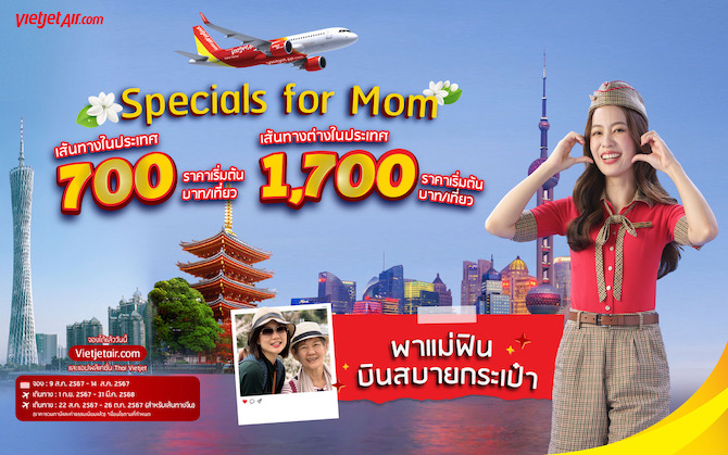 เวียตเจ็ทไทยแลนด์เชิญชวนผู้โดยสารบอกรักแม่ด้วยโปรโมชั่น "พาแม่ฟิน บินสบายกระเป๋า (Specials for Mom)" เสนอบัตรโดยสารราคาพิเศษ เริ่มต้นเพียง 700 บาท (ราคารวมภาษีและค่าธรรมเนียม) สำหรับเดินทางบนเครือข่ายเส้นทางบินภายในประเทศ และราคาเริ่มต้น 1,700 บาท (ราคารวมภาษีและค่าธรรมเนียม) สำหรับเส้นทางบินระหว่างประเทศของเวียตเจ็ทไทยแลนด์ สามารถสำรองบัตรโดยสารได้ตั้งแต่วันนี้จนถึงวันที่ 14 สิงหาคม 2567 ใช้เดินทางได้ระหว่างวันที่ 1 กันยายน 2567 –31 มีนาคม 2568 (ยกเว้นวันหยุดนักขัตฤกษ์) ที่ th.vietjetair.com