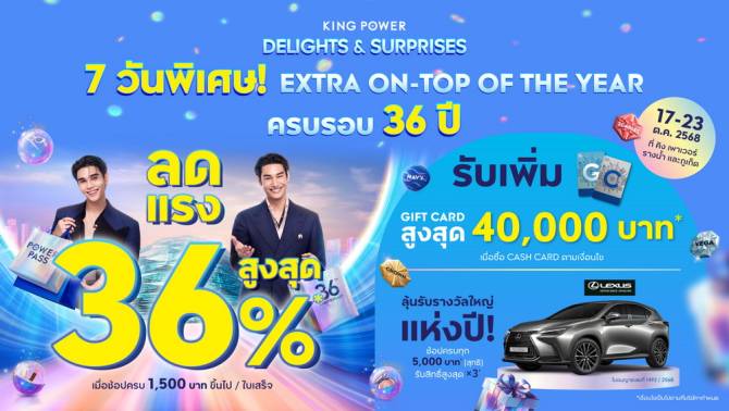 คิง เพาเวอร์ ฉลองครบรอบ 36 ปี ส่งมอบโปรโมชันที่ดีที่สุดแห่ งปี จัดแคมเปญ “KING POWER DELIGHTS & SURPRISES MORE POWER MORE POSSIBILITIES WITH POWER PASS 7 วันพิเศษ! เดือนเกิด คิง เพาเวอร์ คุ้มจนต้องช้อป EXTRA ON-TOP OF THE YEAR ครบรอบ 36 ปี ลดสูงสุด 36%” ตั้งแต่วันที่ 17 – 23 ตุลาคม 2568 ที่ คิง เพาเวอร์ รางน้ำ และภูเก็ต ดังนี้