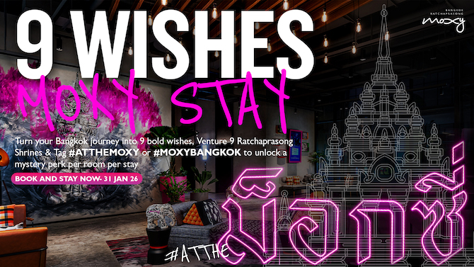 แพ็กเกจนี้เปิดให้จองและเข้าพักได้ตั้งแต่วันนี้จนถึงวันที่ 31 มกราคม 2569โดยแพ็กเกจ “9 Wishes, Moxy Stay” นี้ชวนแขกออกเดินทางตามรอย เส้นทางไหว้ขอพร 9สถานที่ศักดิ์สิทธิ์ในกรุงเทพฯ ซึ่งสามารถเริ่มได้จากโรงแรมโดยตรงเส้นทางสายมูยอดนิยมนี้เชื่อกันว่าจะนำพาความโชคดี ความสำเร็จ และสิริมงคลตลอดปีเหมาะสำหรับนักเดินทางที่ต้องการต้อนรับปีใหม่ด้วยแรงบันดาลใจและพลังบวก