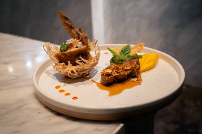 เชฟมานะชัยเปิดฉากด้วยคอร์ส “Prelude to the Journey” ผ่านเมนู Raw Thai Wagyu Beef Salad with Wild Basil Leaves ที่นำเสนอรสชาติจากรากเหง้าแห่งอีสาน ถ่ายทอดเรื่องราวของความกล้าหาญและความเรียบง่ายที่ซ่อนความประณีตไว้ในทุกองค์ประกอบ