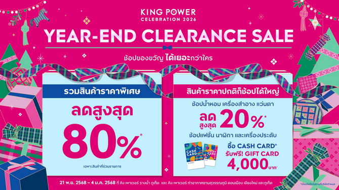 คิง เพาเวอร์ จัดแคมเปญสุดยิ่งใหญ่ส่งท้ายปี “YEAR – END CLEARANCE SALE” พบกับสินค้าสุดเอ็กซ์คลูซิ ฟจากแบรนด์ดัง ลดกระหน่ำสูงสุดถึง 80% เอาใจทุกไลฟ์สไตล์ ทั้งแฟชั่น น้ำหอม เครื่องสำอาง และอีกมากมายที่ร่วมรายการ ตั้งแต่วันที่ 21 พฤศจิกายน 2568 - 4 มกราคม 2569 พบกับโซนสินค้า YEAR END CLEARANCE SALE ได้ที่บริเวณ HALLWAY คิง เพาเวอร์ รางน้ำ ช้อปก่อน คุ้มก่อน ของมีจำนวนจำกัด!