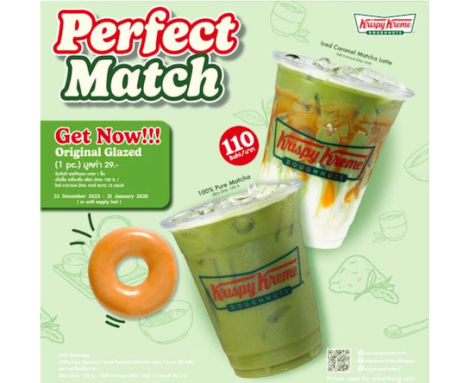 สัมผัสความอร่อยส่งท้ายปี ต้องรับปีใหม่ไปกับ 2 เครื่องดื่มมัทฉะที่หลายคนคิดถึงในราคาเพียง 85 บาท (ขนาด 12 ออนซ์) พร้อมรับสิทธิพิเศษกับโปรโมชั่น Krispy Kreme Perfect Match เพียงจับคู่ความอร่อยของเครื่องดื่ม เพียว มัทฉะ 100% หรือ ไอซ์ คาราเมล มัทฉะ ลาเต้ กับ โดนัทออริจินัล เกลซ เนื้อนุ่ม 1 ชิ้น ในราคาเพียง 110 บาท ตั้งแต่วันที่ 22 ธันวาคม 2568 – 31 มกราคม 2569 ที่ร้านคริสปี้ ครีม ทุกสาขาใกล้บ้านคุณ (เฉพาะสาขาที่ร่วมรายการ ยกเว้น คาร์ท, ฟู้ดทรัค และบ็อกซ์ช้อป)