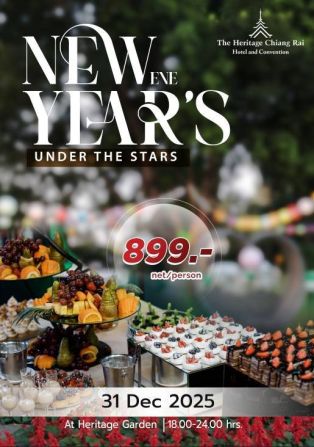 โรงแรมเฮอริเทจ เชียงราย โฮเท็ล แอนด์ คอนเวนชั่นขอเชิญร่วมเฉลิมฉลองคืนส่งท้ายปีเก่า ต้อนรับปีใหม่ 2569 กับ “New Year’s Eve Under the Stars” ดินเนอร์บุฟเฟต์ส่งท้ายปีท่ามกลางบรรยากาศสวนยามค่ำคืน ณ Heritage Garden ในวันพุธที่ 31 ธันวาคม 2568 ตั้งแต่เวลา 18.00 –24.00