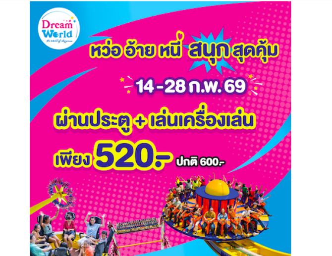 นางสาวรัสรินทร์ มิลินวรพัฒน์ ผู้จัดการฝ่ายการตลาด เปิดเผยว่า โอกาสวันวาเลนไทน์และตรุษจีนที่จะถึงนี้ ดรีมเวิลด์ขอส่งโปรบอกรัก หว่ออ้ายหนี่ ให้กับลูกค้าทุกท่าน ตั้งแต่ 14 – 28 กพ.69 เพียงซื้อบัตรรวมเครื่องเล่น ราคา 600 บาท ลดเหลือ 520 บาท เท่านั้น ซึ่งตัวเลขดังกล่าวเป็นเลขบอกรักในภาษาจีน จึงชวนทุกครอบครัวพาคนรักมาพักผ่อน สนุกสนานกับเครื่องเล่นนานาชนิดกว่า 25 รายการ รวมเครื่องเล่นใหม่อย่างไซโคลน เหวี่ยงสนุก สุดทุกองศา ชุ่มฉ่ำกับเครื่องเล่นวอเตอร์ฟัน สนามเล่นน้ำของทุกครอบครัวอีกด้วย