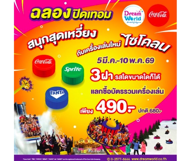 นางสาวรัสรินทร์ มิลินวรพัฒน์ ผู้จัดการฝ่ายการตลาด สวนสนุกดรีมเวิลด์ กล่าวว่า ปิดเทอมใหญ่ปี 2569 เริ่มขึ้นแล้ว ตั้งแต่วันที่ 5 มีนาคม – 10 พฤษภาคม 2569 ดรีมเวิลด์จัดโปร “สนุก..ซ่ากับโค้ก” โดยลูกค้า ทุกเพศ ทุกวัย สามารถนำฝา โค้ก สไปรท์ หรือแฟนต้า รสใดขนาดใดก็ได้ คนละ3 ฝา แลกรับส่วนลดซื้อบัตรเข้าพร้อมเล่นอย่างละรอบ จากปกติ 680บาท พิเศษเหลือ 490บาท ให้ทุกท่านได้เข้าไปสนุกกับเครื่องเล่นใหม่ไซโคลนและเครื่องเล่นยอดฮิตอื่นๆ กว่า 27 รายการ อาทิ วอเตอร์ฟัน สนามเล่นน้ำของเด็กๆ แกรนด์แคนยอน รวมถึงซูเปอร์ สแปลช เครื่องเล่นที่วัยรุ่นGen Z ต้องไม่พลาด อย่าง เฮฺอริเคน ทอร์นาโด ไวกิ้งส์ แบล็คโฮลโคสเตอร์ ก็รวมแล้ว