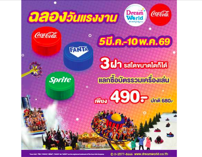 นางสาวรัสรินทร์ มิลินวรพัฒน์ ผู้จัดการฝ่ายการตลาด สวนสนุกดรีมเวิลด์ กล่าวว่า สวนสนุกดรีมเวิลด์ ต้อนรับวันหยุดช่วงต้นเดือนพฤษภาคม ศกนี้ ด้วยโปรโมชั่นสุดพิเศษผ่านประตูพร้อมเล่นเครื่องเล่น เพียง 490.- เมื่อนำฝาโค้ก แฟนต้า สไปรท์ แบบใดขนาดใดก็ได้ คนละ3 ฝา ใช้แลกเป็นส่วนลด จากปกติ 680.- แลกซื้อได้ทั้งเด็กและผู้ใหญ่ เข้าไปสนุกสนานกับเครื่องเล่นมากมาย อาทิ เครื่องเล่นครอบครัวอย่างบ้านยักษ์ ม้าหมุน หนูลมกรด สนุกกับเครื่องเล่นใหม่ ไซโคลน เหวี่ยงสนุก สุดทุกองศาและเครื่องเล่นทางน้ำฉ่ำๆ อย่างแกรนด์แคนยอน ซูเปอร์สแปลช ลานน้ำมหาสนุก วอเตอร์ฟัน และเครื่องเล่นยอดฮิตมากกว่า30 รายการ ส่วนการแสดงโชว์ช่วง 13.00 น. และ 16.00น. พบกับโชว์ฮอลลีวู้ดแอ็คชั่น หรือจะขบวนพาเหรด รอบทะเลสาบ เวลา 15.00 น. คุ้มสุุดสุดใน 1 วัน