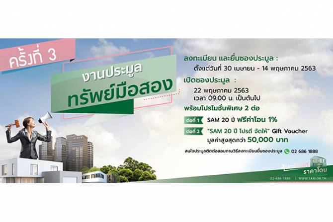 นายนิยต กล่าวเพิ่มเติมว่าสำหรับลูกค้าที่สนใจซื้อทรัพย์รายการอื่นๆ นอกเหนือจากการประมูล 2 รอบพิเศษนี้ ยังสามารถติดต่อซื้อโดยตรงกับ SAM ได้อย่างสะดวก รวดเร็วและหลากหลายช่องทางเช่นเคย ทั้งเว็บไซต์ www.sam.or.th แอปพลิเคชัน SAM NPA ทั้งระบบ Android และ IOS รวมทั้งอีกหลากหลายช่องทางบนออนไลน์ โดยแอด ID Line @Samline หรือ สานฝันต่อยอดสินทรัพย์กับ SAM บน Facebook หรือ SAM NPA Channel บน YouTube และ @SAM_NPA บน Twitter เพื่อติดตามข้อมูลข่าวสารดีๆ จาก SAM นอกจากนี้ เพื่อช่วยบรรเทาภาระลูกค้าในช่วงวิกฤตโควิด-19 SAM ได้ขยายระยะเวลาโปรโมชั่นหลายตัวออกไปอีก 1-2 เดือน โดยเฉพาะโปรดีๆ ที่ได้รับความนิยมจากลูกค้ามาอย่างต่อเนื่อง อาทิ “SAM 20 ปีฟรีโอน 1%” และ ”SAM 20 ปีฟรีโอนไม่อั้น” รวมทั้ง “SAM Light” ผ่อนสบายๆ 0% นานสูงสุดถึง 2 ปี และ “SAM Super Light” ผ่อนสบายๆ ปลอดดอกเบี้ยนานสูงสุดถึง 4 ปี ทั้งนี้ รายละเอียดการรับสิทธิ์โปรโมชั่นต่างๆ เป็นไปตามเงื่อนไขที่ SAM กำหนด