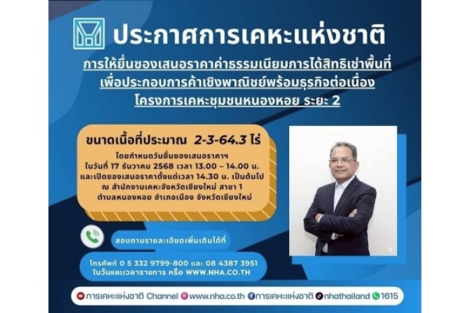 การเคหะแห่งชาติจึงเปิดโอกาสให้เอกชนที่สนใจสามารถยื่นข้อเสนอราคาการได้สิทธิเช่าที่ดินดังกล่าว โดยมีอัตราค่าธรรมเนียมการได้สิทธิเช่าขั้นต่ำไม่น้อยกว่า 3,530,000 บาท ระยะเวลาการให้สิทธิเช่า 9 ปี ในอัตราค่าเช่ารายเดือน ปีที่ 1-3 เดือนละ 194,300 บาท ปีที่ 4-6 เดือนละ 211,800 บาท ปีที่ 7-9 เดือนละ 230,900 บาท กำหนดหลักประกันการยื่นซองเสนอราคาจำนวน 150,000 บาท กำหนดเงินประกันการปฏิบัติตามสัญญา จำนวน 692,700 บาท โดยกำหนดวันยื่นข้อเสนอราคาฯ ในวันที่ 17 ธันวาคม 2568 เวลา 13.00-14.00 น. และกำหนดเปิดซองเสนอราคาตั้งแต่เวลา 14.30 น. เป็นต้นไป ณ สำนักงานเคหะจังหวัดเชียงใหม่ สาขา 1 ตำบลหนองหอย อำเภอเมือง จังหวัดเชียงใหม่