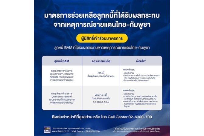 ดร.รักษ์ วรกิจโภคาทร ประธานเจ้าหน้าที่บริหาร บริษัทบริหารสินทรัพย์ กรุงเทพพาณิชย์ จำกัด (มหาชน) หรือ BAM กล่าวว่า จากเหตุการณ์ความไม่สงบในบริเวณชายแดนไทย-กัมพูชา BAM มีความห่วงใยทหาร ตำรวจ ข้าราชการ บุคลากรทางการแพทย์ และประชาชนในบริเวณพื้นที่ที่ได้รับผลกระทบจากเหตุการณ์ดังกล่าว ซึ่งในกลุ่มบุคคลเหล่านี้ หากเป็นลูกหนี้ปรับโครงสร้างหนี้กับ BAM ที่ถือเป็นวีรบุรุษผู้เสียสละทั้ง ทหาร ตำรวจ ข้าราชการ บุคลากรทางการแพทย์ ที่เสียชีวิต หรือทุพพลภาพในขณะปฏิบัติหน้าที่ในเหตุการณ์ความไม่สงบตามแนวชายแดนไทย-กัมพูชา BAM จะยกหนี้ให้ทั้งเงินต้นและดอกเบี้ย ส่วนกรณีลูกหนี้ที่ได้รับผลกระทบและทำให้ขาดรายได้หรือรายได้ลด ส่งผลให้กำลังความสามารถในการชำระหนี้ลดลง BAM พร้อมพักชำระหนี้ทั้งเงินต้นและดอกเบี้ยให้จนถึงวันที่ 31 มีนาคม 2569 เพื่อเป็นการบรรเทาความเดือดร้อน