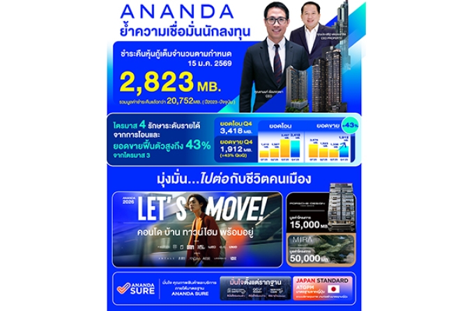 บริษัท อนันดา ดีเวลลอปเม้นท์ จำกัด (มหาชน) ประกาศความสำเร็จครั้งใหญ่ด้วยการชำระคืนหุ้นกู้ครบกำหนดเต็มจำนวน 100% ในวันที่ 15 มกราคม 2569 รวมมูลค่า 2,823 ล้านบาท โชว์ศักยภาพในการบริหารงานที่มีการเติบโตอย่างต่อเนื่อง รวมถึงวินัยทางการเงิน การบริหารสภาพคล่องอย่างรอบคอบ เป็นปัจจัยสำคัญในการชำระคืนหุ้นกู้ครบกำหนด เผยไตรมาส 4 ยอดขายฟื้นตัวสูงถึง 43% จากไตรมาส 3 พร้อมเดินหน้าส่งแคมเปญ LET’S MOVE เลือกที่ใช่แล้วย้ายเลย พร้อมขอบคุณนักลงทุนที่มอบความไว้วางใจ และร่วมเป็นส่วนหนึ่งของความสำเร็จครั้งนี้ ย้ำมุ่งมั่นดูแลผู้ถือหุ้นกู้และนักลงทุนอย่างต่อเนื่อง