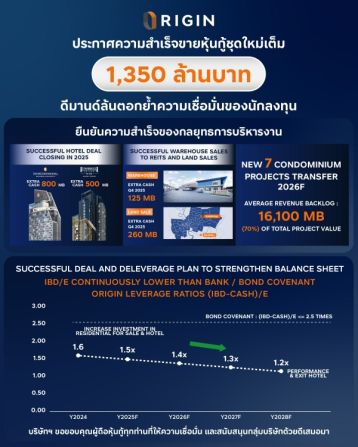นายพีระพงศ์ จรูญเอก ประธานเจ้าหน้าที่บริหาร บริษัท ออริจิ้น พร็อพเพอร์ตี้ จำกัด (มหาชน) หรือ ORI เปิดเผยว่า บริษัทดำเนินธุรกิจตาม Roadmap ที่วางไว้ โดยกลุ่มธุรกิจ Recurring Income ทั้งจากการให้บริการในกลุ่มโรงแรม และกลุ่มคลังสินค้า เพื่อสร้างรายได้ประจำต่อเนื่อง โดยในไตรมาส 4/2568 ที่ผ่านมา กลุ่มธุรกิจคลังสินค้าภายใต้การดำเนินธุรกิจของ บริษัท แอลฟา อินดัสเทรียล โซลูชั่น จำกัด หรือ ALPHA ได้ขายคลังสินค้า 1 แห่งในทำเล กม. 22 ขนาดพื้นที่ 21,660 ตารางเมตร(ตร.ม.) เข้ากองทรัสต์เพื่อการลงทุนในอสังหาริมทรัพย์ (REIT) ส่งผลให้กลุ่มบริษัทมีกระแสเงินสดรับสุทธิ (Extra Cash) 125 ล้านบาท พร้อมกันนี้ยังได้จำหน่ายทรัพย์สินที่ดินพร้อมพัฒนา 2 แปลง ย่านรามอินทราและย่านบางพลี ได้รับ Extra Cash กว่า 260 ล้านบาท