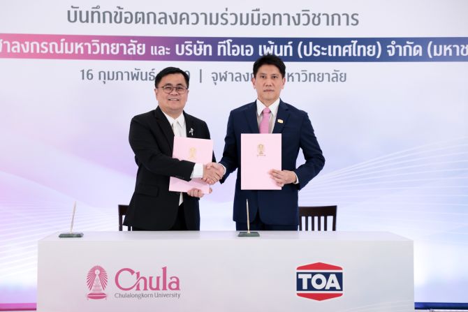 บริษัท ทีโอเอ เพ้นท์ (ประเทศไทย) จำกัด (มหาชน) หรือ TOA ผู้นำอุตสาหกรรมสีทาอาคารอันดับ 1 เคมีภัณฑ์ก่อสร้าง และวัสดุปกป้องพื้นผิวครบวงจรของไทย ประกาศความร่วมมือทางวิชาการครั้งสำคัญกับจุฬาลงกรณ์มหาวิทยาลัย ลงนามบันทึกข้อตกลง (MOU) เปิดตัวโครงการ “THE CREATIVE CANVAS ผืนผ้าใบแห่งความคิดสร้างสรรค์เพื่ออนาคตที่ไม่หยุดนิ่ง” มุ่งเปลี่ยนพื้นที่มหาวิทยาลัยให้เป็นเวทีปล่อยของสำหรับนิสิตยุคใหม่ นำร่อง 4 โปรเจกต์ไฮไลท์ ผ่านการบูรณาการองค์ความรู้สู่การปฏิบัติจริงในโลกธุรกิจ โดยมี นายจตุภัทร์ ตั้งคารวคุณ ประธานเจ้าหน้าที่บริหาร TOA และ ศ.ดร.วิเลิศ ภูริวัชร อธิการบดีจุฬาลงกรณ์มหาวิทยาลัย ร่วมลงนาม และแสดงวิสัยทัศน์ ณ เรือนจุฬานฤมิต จุฬาลงกรณ์มหาวิทยาลัย