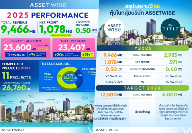 นายกรมเชษฐ์ วิพันธ์พงษ์ ประธานเจ้าหน้าที่บริหาร บริษัท แอสเซทไวส์ จำกัด (มหาชน) หรือ ASW กล่าวว่า ASW สามารถสร้างผลการดำเนินงานปี 2568 ได้อย่างมีประสิทธิภาพ โดยมียอดขายทั้งปี 23,407 ล้านบาท เติบโตจากปีก่อน 21% ขณะที่รายได้รวมอยู่ที่ 9,466 ล้านบาท และมีกำไรสุทธิ 1,078 ล้านบาท โดยเฉพาะไตรมาส 4/68 บริษัททำรายได้และกำไรสุทธิเติบโตขึ้นเมื่อเทียบกับไตรมาสก่อนหน้า (QoQ) และปีก่อนหน้า (YoY) จากการเร่งผลักดันยอดโอนกรรมสิทธิ์โครงการเดอะ ไทเทิล เลเจนดารี บางเทา (THE TITLE Legendary Bang-Tao) รวมถึงโครงการเคฟ วันเดอร์แลนด์ (Kave Wonderland) และโมดิซ อาวองการ์ด (Modiz Avantgarde) ซึ่งสร้างเสร็จเร็วกว่าแผนที่กำหนดไว้ต้นปี 2569 ทำให้ ASW สามารถทยอยรับรู้รายได้ตั้งแต่ปลายปีที่ผ่านมา