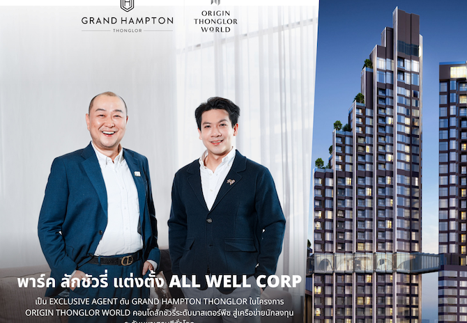 โดยแต่งตั้งให้ All Well Corp เป็น Exclusive Master Agent ดูแลงานขายและการตลาดของโปรเจ็กต์ระดับแฟลกชิป Grand Hampton Thonglor ที่พักอาศัยเพื่อการลงทุน ภายในโครงการ Origin Thonglor World ซึ่งเป็นที่พักอาศัยในรูปแบบของ Hotel Serviced Residence ระดับ 5 ดาว พร้อมบริการส่วนตัว และสิ่งอำนวยความสะดวกครบครันระดับโรงแรม รวมถึง All Day Dining พร้อมบริการจากทาง HHR (Hampton Hotel & Residence Management) ซึ่งเป็นบริษัทในเครือออริจิ้น ดูแลบริหารปล่อยเช่า สู่ตลาดสากลทั่วโลกผ่านเครือข่ายของ All Well Corp เพื่อสร้างผลตอบแทนให้กับนักลงทุนที่มองหาความเหนือระดับทั้งด้านไลฟ์สไตล์และการบริหารสินทรัพย์
