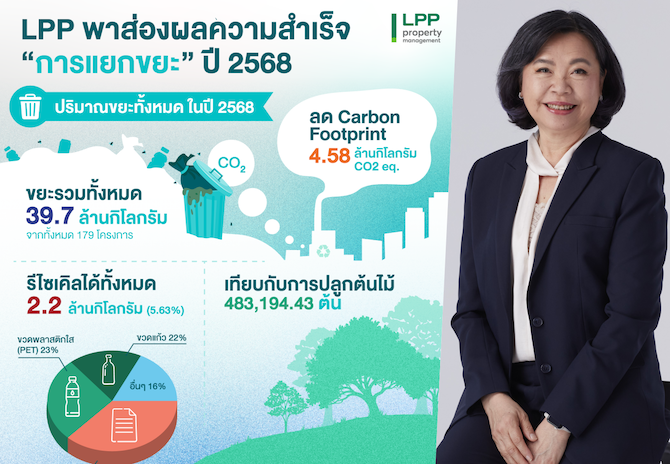 นางสาวสมศรี เตชะไกรศรี กรรมการผู้จัดการ บริษัท แอล พี พี พรอพเพอร์ตี้ มาเนจเมนท์ จำกัด (LPP) เปิดเผยว่า จากรายงานสรุปผลการดำเนินงานระหว่างเดือน มกราคม–ธันวาคม 2568 ของ LPP เป็นจำนวนขยะรวมทั้งหมด 39,748,123.59 kg. โดยสามารถบริหารจัดการคัดแยกขยะรีไซเคิลได้รวมทั้งสิ้น 2,238,796.06 กิโลกรัม ซึ่งการคัดแยกขยะอย่างมีประสิทธิภาพนี้ส่งผลเชิงบวกต่อสิ่งแวดล้อมได้อย่างมาก โดยสามารถลดปริมาณคาร์บอนฟุตพริ้นท์ (Carbon Footprint) ได้สูงถึง 4,579,770.78 kg. / CO2 eq. หรือเทียบเท่ากับการปลูกต้นไม้เพื่อดูดซับก๊าซคาร์บอนไดออกไซด์จำนวน 483,194.43 ต้น โดยมีสัดส่วนประเภทขยะที่คัดแยกได้สูงสุด 3 อันดับแรก ได้แก่ 1. กระดาษ 39% 2. ขวดพลาสติกใส (PET) 23% 3.ขวดแก้ว 22% และประเภทอื่นๆ ตามลำดับ อาทิ ขวดนม 8% กระป๋องอลูมิเนียม 2% เหล็ก 2% และขยะรีไซเคิลไม่แยกประเภท 4%