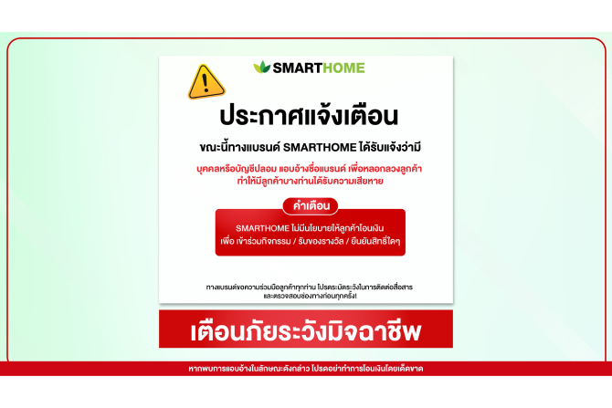 ‘สมาร์ทโฮม’ ออกประกาศเตือนหลังพบแอบอ้างแบรนด์หลอกลวงลูกค้า